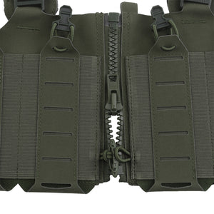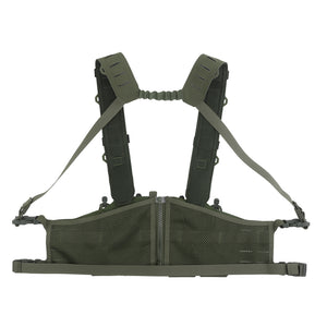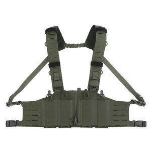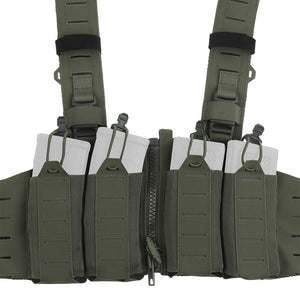 This lightweight SF chest rig is constructed from durable black nylon and features adjustable attachment clips for a secure fit. Designed for practicality and versatility, it includes four AR/M4 magazine slots, multiple laser-cut MOLLE attachment points, and two belly storage pockets—perfect for enhancing your loadout during airsoft games.