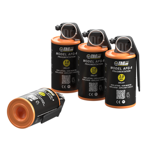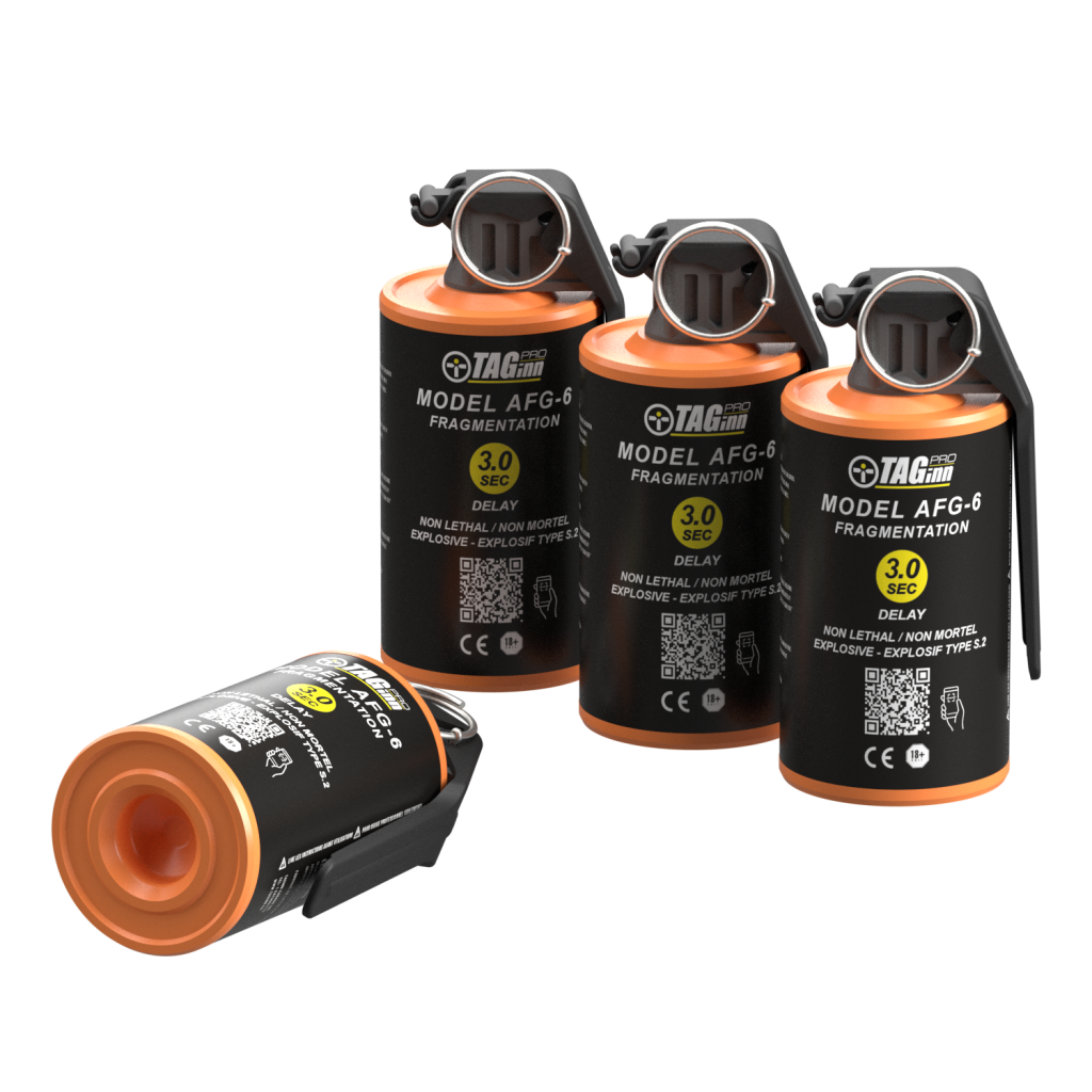 The AFG-6 is a field-grade pyrotechnical grenade. It is the most affordable TAGinn grenade currently on the market. The AFG-6 consists of a foamed polyurethane and cardboard body filled with non lethal dried peas as an alternative to non-biodegradable BB’s.