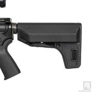 The EPS-2's cheek weld has been redesigned also to better mimic that of a conventional Crane stock. The buttpad is slightly slimmer and rubberized with our trademark EP dot texture for improved comfort and grip. The smooth sloping front end of the stock prevents the rifle from catching on its sling or other gear. QD (Quick Detach) swivel sockets are positioned on both sides of the stock.